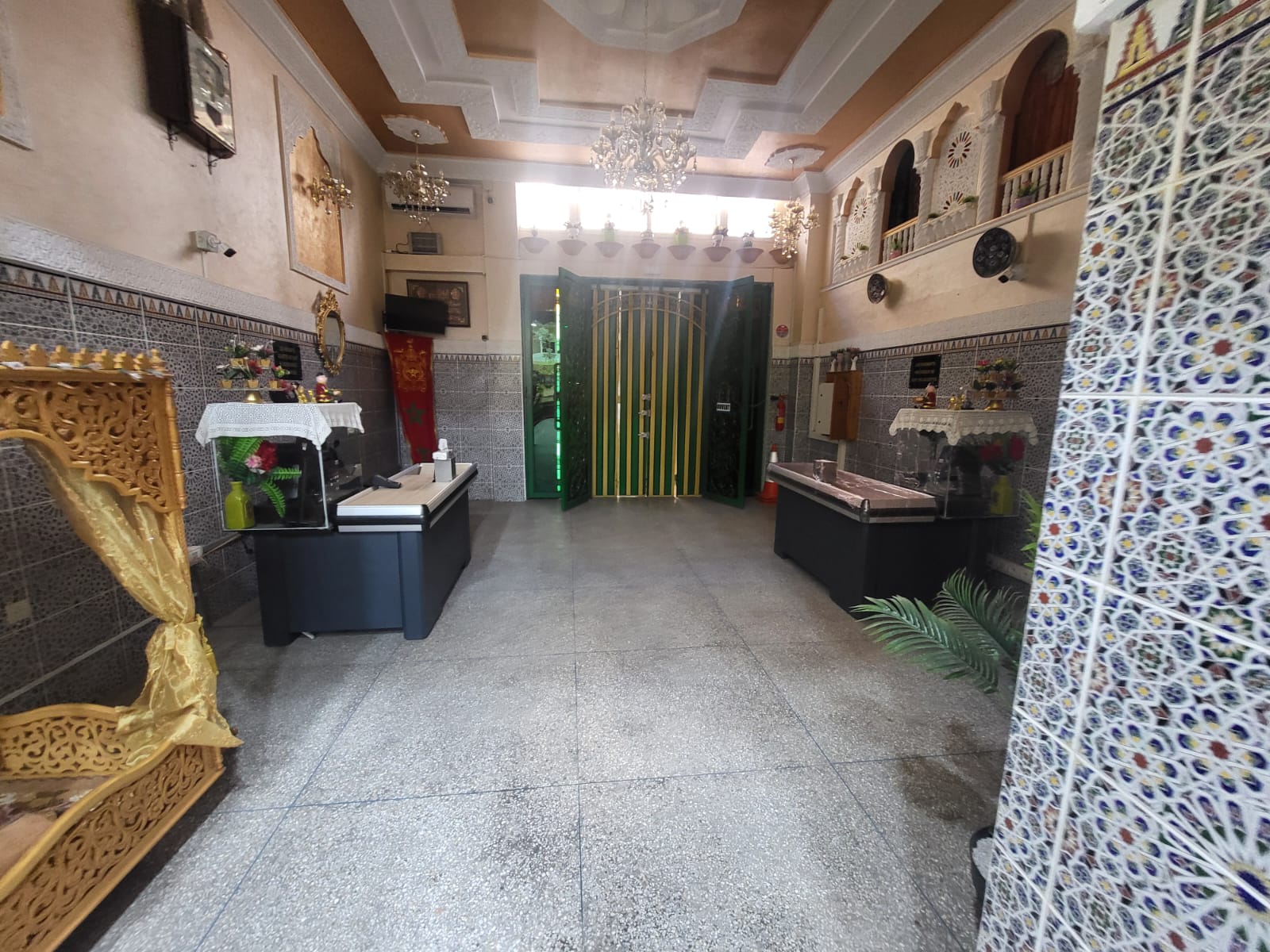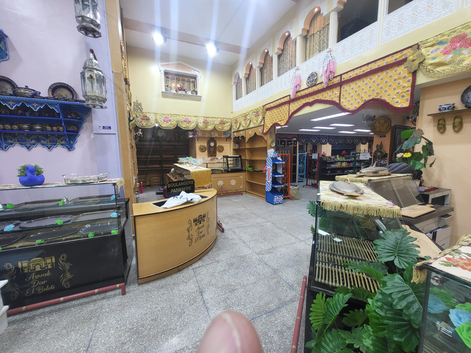 Ambiance : boiseries sculptées, vitrine élégante, atmosphère chaleureuse inspirée des souks marocains